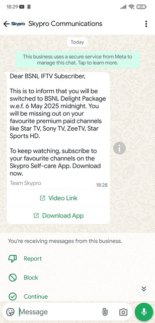 This is to inform that you will be switched to BSNL Delight Package w.e.f. 6 May 2025 midnight. You will be missing out on your favourite premium paid channels like Star TV, Sony TV, ZeeTV, Star Sports HD.