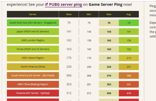 https://pubgserverping.com Open this website in your pc connected through the ethernet cable and not from wifi for 1-2 minute to get an average ping from the servers and please mention the city you are from. Does the ping stay same all the time or it changes with the IP address like today it is near 80ms from Singapore and the next day when your dynamic IP changes it becomes 250ms from Singapore.